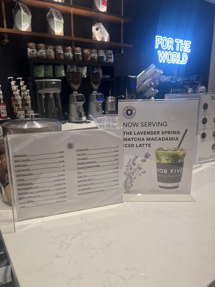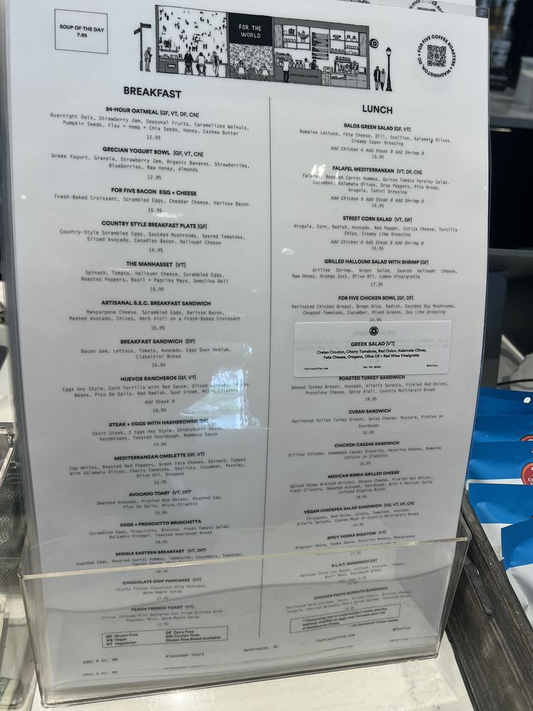For Five Coffee Roasters is a breakfast and brunch spot in Washington, DC, with a focus on coffee, tea, and sandwiches. Their diverse menu includes options like 24-hour oatmeal, Greek yogurt bowls, loaded soups, and Mediterranean-inspired lunch items like the Balos Green Salad and Falafel Mediterranean. Customers rave about the quality of the food and coffee, with standout items like the caramel cold brew and vegan chicken salad sandwich. The cozy and inviting atmosphere, along with amenities like free Wi-Fi and outdoor seating, make it a great spot for both work and relaxation. With a range of delicious and fresh options available, For Five Coffee Roasters is a must-visit for those looking for a satisfying meal in a welcoming environment.
